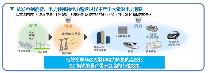 此产品安装在工业设备和太阳能电池等中负责电力转换的变频器、转换器上,与普通的Si(硅)材质的IGBT??橄啾?,具备以下优势,有效解决了世界能源和资源等地球环境问题。