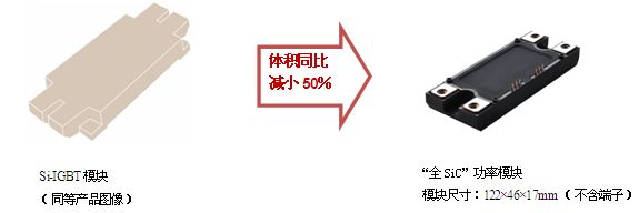 不仅如此,通过设计和工艺的改善,罗姆还成功开发出散热性卓越的???。替换传统的400A级别的Si-IGBT??槭?,体积可减小约50%。由于损耗低,因此发热少,可减小外置的冷却装置体积,从而非常有助于设备整体的小型化。