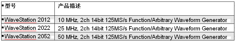 力科公司日前宣布发布WaveStationTM 系列函数/任意波形发生器。WaveStation最高信号生成频率50MHz,提供3.5”大屏幕显示,直观的人机交互界面,全系标配双通道输出和PC端波形编辑功能。WaveStation系列包含三款型号,带宽分别为10 MHz, 25 MHz和50 MHz;采样率125MS/s,14-bit分辨率,每通道16Kpts存储深度。WaveStation除拥有基本函数波形:正弦、方波、斜坡、脉冲和噪声等信号之外,还内置了超过40种任意波形函数库。创新的3.5”彩色显示屏方便将预览波形和波形参数同时显示,如频率、幅值、偏置和相位等。WaveStation提供了多种调制模式:AM, PM, FM, ASK, PSK, FSK和PWM,可以通过前面板直接编辑。仪器提供了必需的I/O接口方便与其他设备同步,同时提供标准USB和GPIB接口用于远程控制和自动化编程,WaveStation的发布定位于强大,灵活的波形生成能力。