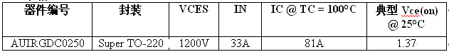 1200V AUIRGDC0250 采用紧凑的 Super TO-220 封装,低 VCE(on) 可让该器件降低功耗并实现更高的功率密度,正 VCE(on) 温度系数则使其更适合并联。此外,AUIRGDC0250 还提供经过优化的方形反向偏压安全操作区 (RBSOA)。AUIRGDC0250 的软开关特性使其成为帮助客户符合系统级 EMI 规范的理想选择。