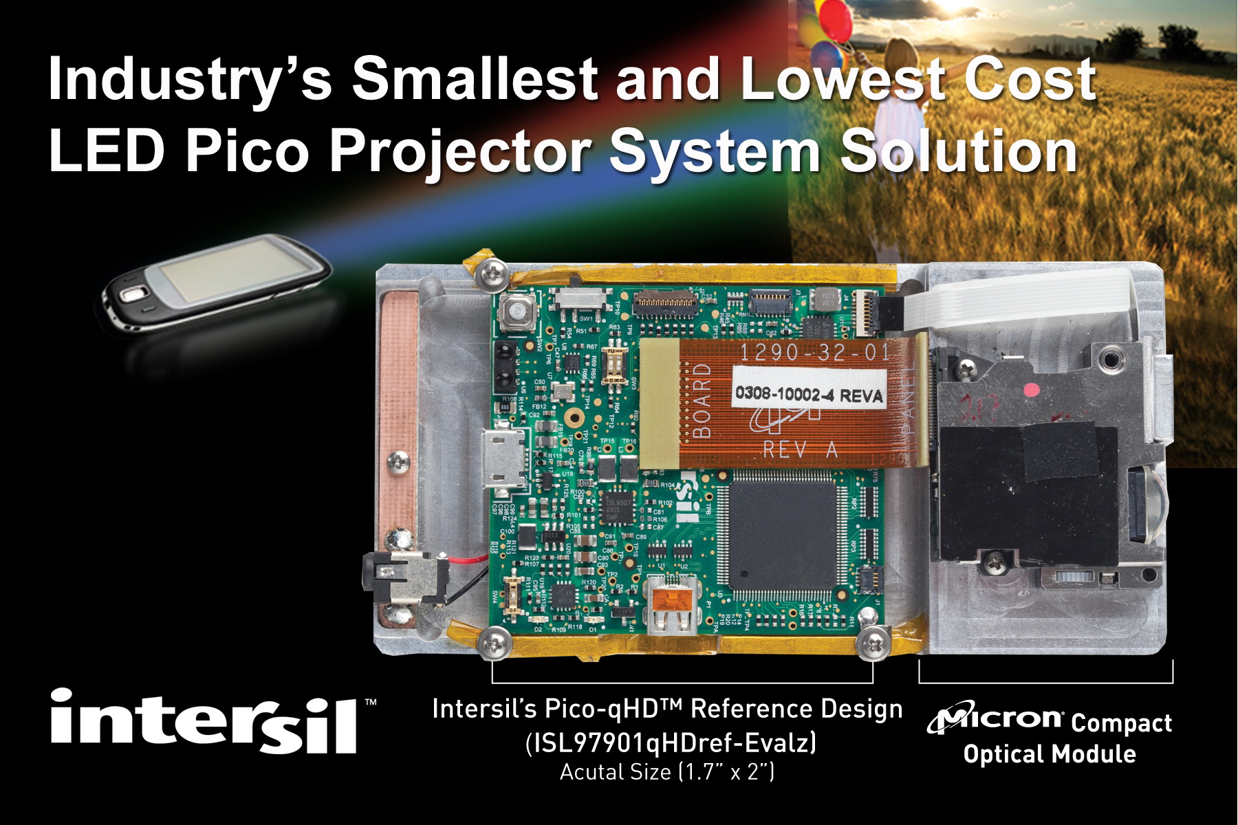 全球高性能模拟混合信号半导体设计和制造领导厂商Intersil公司日前天宣布,推出全球最低成本微型投影仪系统Pico-qHD™,以及已达到生产就绪阶段的业内最小的基于LED的LCoS微型投影仪解决方案。