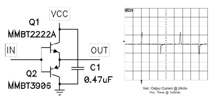 如图2 hfe曲线所示,通常厂商都不会为这些低电流器件提供高于0.5A的电流。但是,该电路可提供大大高于0.5A的电流驱动,如图1中的波形所示。就该波形而言,缓冲器由一个50Ω源驱动,负载为一个与1Ω电阻串联的0.01 uF电容。该线迹显示了1Ω电阻两端的电压,因此每段接线柱上的电流为2A.该数字还显示MMBT2222A可以提供大约3A的电流,MMBT3906吸收2A的电流。