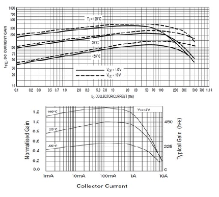 事实上,晶体管将与其组件进行配对(MMBT3904用于3906,MMBT2907用于2222)。这两个不同的配对仅用于比较。这些器件还具有更高的电流和更高的hfe, 如FMMT618/718对,其在6A电流时具有100 的hfe(请参见图2)。与集成驱动器不同,分立器件是更低成本的解决方案,且有更高的散热和电流性能。