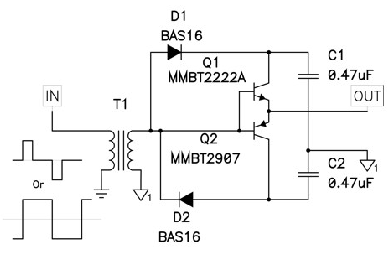 图3显示了一款可使您跨越隔离边界的简单缓冲器变量情况。一个信号电平变压器由一个对称双极驱动信号来驱动。变压器次级绕组用于生成缓冲器电力并为缓冲器提供输入信号。二极管D1和D2对来自变压器的电压进行调整,而晶体管Q1和Q2则用于缓冲变压器输出阻抗以提供大电流脉冲,从而对连接输出端的FET进行充电和放电。该电路效率极高且具有50%的占空比输入(请参见图3中较低的驱动信号),因为其将驱动FET栅极为负并可提供快速开关,从而最小化开关损耗。这非常适用于相移全桥接转换器?! ?br />