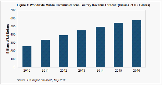上述预测数据由无线通信产业各领域中的OEM厂商的总体工厂营业收入构成,包括手机、媒体平板和移动基础设备等主要领域,以及无线路由器、无绳电话、电池充电器和灰市手机等辅助领域。