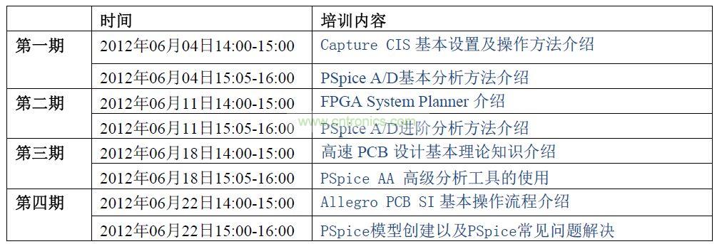 课程分为四期,内容包括Capture CIS、PSpice、FPGA System Planner 以及Allegro PCB SI 培训。
