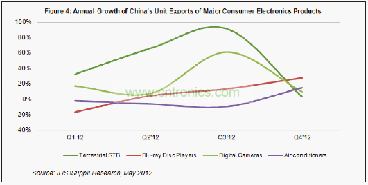 据IHS iSuppli公司的中国研究服务,2012年第一季度中国主要消费电子产品的出口高于预期,主要是因为销售渠道中的库存较低,需要购买更多产品以补充库存。