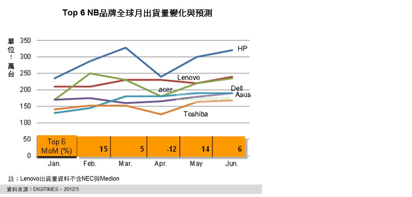DIGITIMES Research资深分析师兼主任简佩萍分析,品牌与代工厂NB月出货量方面,在历经低迷的4月后,5月搭配英特尔(Intel)新品NB铺货效应,出现两位数的月成长幅度;但整体而言仍较先前预测的出货成长缓和许多,尤其对6月份的出货展望,全球前6大品牌普遍保守,预期前6大品牌月NB出货量成长幅度也将因此骤降至个位数。