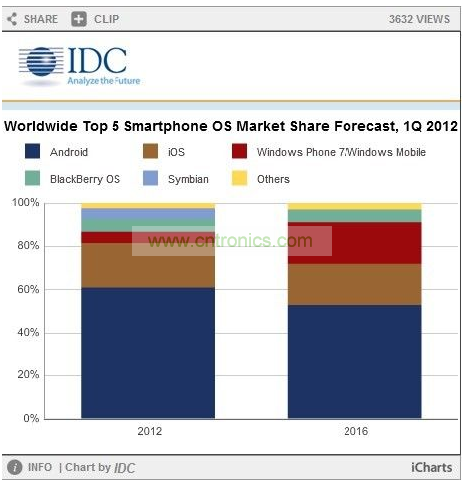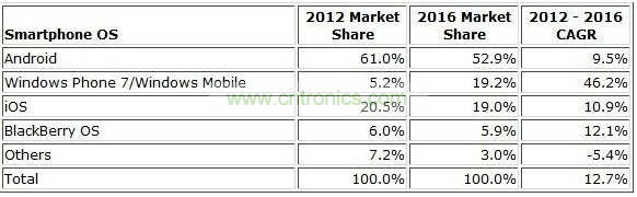 下表反映了IDC对2012年和2016年全球智能手机操作系统所占市场份额以及2012到2016年之间复合年增长率的预期: