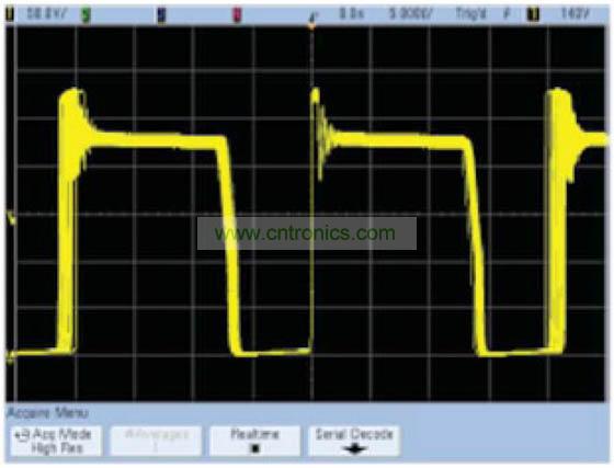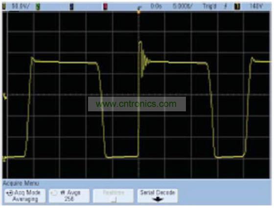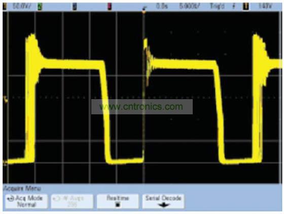 这种算法在垂直分辨率为12位时效果最好,因为再继续增加下去,其他因数(例如示波器的垂直增益或偏置精度)将起到决定性作用。平均模式的优点是,它对示波器的实时带宽没有任何限制。缺点是它要求使用重复性信号,并会降低波形更新速率。在正常采集模式下与平均模式下捕获的开关电源的Vds分别如图1和图2所示。