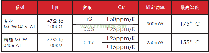 为了提高稳定性,不论应用场合是需要全功率能力还是只需要一小部分标称额定功耗,这些电阻都是同样有效的。电阻有两种型号。MCW 0406 AT 专业系列设备额定功耗高达 300mW,高温性能达到 175°C。