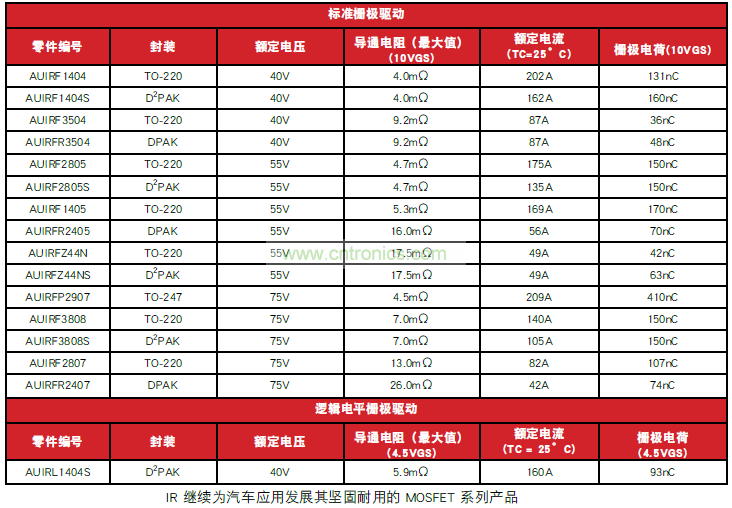 International Rectifier 的符合汽车标准的最新 MOSFET 系列具有低通态电阻和高电流处理能力,可满足传统内燃机(ICE) 平台以及微型和混合动力汽车平台方面的重负载应用。