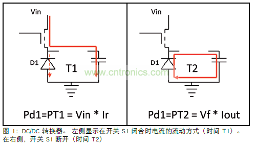 图 1 显示非同步 DC/DC 降压转换器的结构框图。 在T2 期间,输出电流 (Iout) 流过肖特基二极管 D1。 产生的损耗与D1的正向电压 (Vf)和 Iout直接相关。 T2 (PT2)的功率损耗等于 Iout*Vf。 显然,Vf需要尽可能地低,以限制损耗,并最大限度地减少热量的产生。