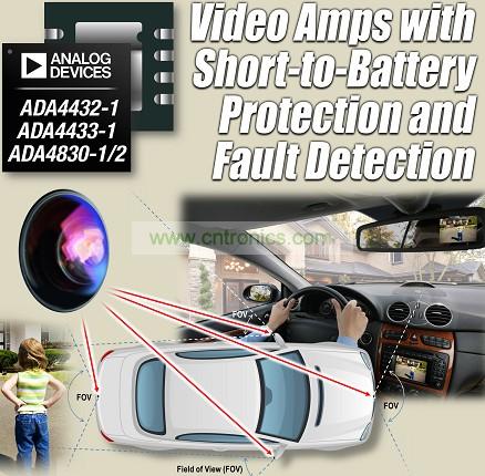 Analog Devices, Inc. ,全球领先的高性能信号处理解决方案供应商,最近推出一系列高速视频放大器ADA4830-1/2和ADA4432-1/33-1,这些器件集成电池短路?;ず凸收霞觳夤δ?,适合汽车安全和信息娱乐应用中的模拟视频系统。ADI公司的这些新款集成式视频放大器采用3mm x 3mm封装,与完全分立式解决方案相比,电路板空间至少节省80%,非常适合后视摄像头等空间受限的应用。ADA4830-1(单通道)和ADA4830-2(双通道)视频差动放大器以及ADA4432-1(单端输出)和ADA4433-1(差分输出)模拟视频滤波器放大器为设计人员提供了通过屏蔽和非屏蔽双绞线电缆传输模拟视频信号的完整芯片组。以上视频放大器也可单独使用,以作为视频信号链一部分来提供接收机(ADA4830-1/2)和发射机(ADA4432-1/33-1)功能。所有这些新款放大器均内置最高18 V的电池短路?;?、接地短路?;?、故障检测、宽共模电压范围和鲁棒的ESD(静电放电)性能。