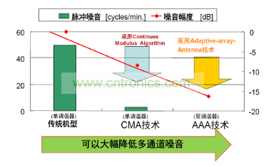 图2将CMA及AAA技术的多通道噪声消除性能与传统技术单调谐器进行了比较。左边纵轴是每分钟脉冲噪声的发生次数,右边纵轴是噪声强度,很明显,安森美半导体的单调谐器技术可以大幅降低多通道噪声,且双调谐器AAA技术几乎可以完全消除多通道噪声。