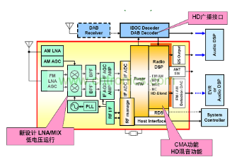 图4是安森美半导体DSP调谐器的框图。从图中可以看出,模拟前端是新设计的新设计LNA和MIX,可低电压运行,只需5 V供电;数字后端可以支持广播接口。DSP采用CMA算法,具有HD混音功能。