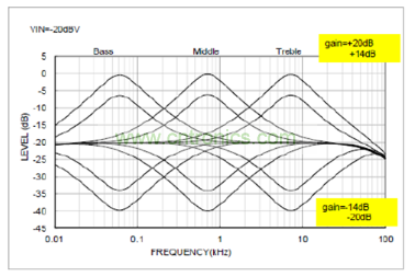为了实现音效处理,有必要了解一下音频DSP均衡器(EQ) 的作用。均衡器具有增益及滤波的电路,增益电路对声音进行提升(Boost) 与削弱(Cut) ;滤波电路可以调节到需要的频率响应。普通模拟音效处理IC一般可以提供2频带(Bass/Treble) 或者3频带(Bass/Middle/Treble),而数字音效处理IC可以提供多个频带,比如7频带,甚至更多。图5是3频带EQ的曲线。