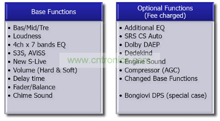 左边表中是一些基本功能,其中S3S、AViSS、New S-Live是安森美半导体自己的算法,可免费提供给客户;右边是可供选择的算法,需要使用授权,或更改时需要研发费用,其中包括业界知名的SRS CS Auto及Dolby DAEP算法,而Bongiovi DPS是最先进的音效处理技术。安森美半导体目前是该技术唯一的IC合作伙伴。