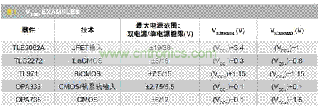 有一个宽输入范围的特例值得一提,这就是轨至轨输入运放。尽管这个名称暗示该运放的输入可以跨越整个电源轨的区间,但并非像人们可能假设的那样,所有轨至轨输入器件都可以覆盖整个电源范围。很多轨至轨输入的运放(如TI的OPA333)确实能跨越整个电源区间,而其它一些则达不到标准,说明有误导性。同样,关键在于查看数据表指定的输入区间规格。