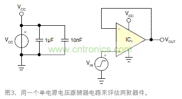为更好地理解违反VICMR的效果,下面给出一些实例。用两只具有不同VICMR规格的运放可演示这些效果。这些器件都有轨至轨的输出,排除了输出级造成的限制。一个单电源的电压跟随器电路用于两只器件的评估(图3)。所有测试均在一个实验台上完成,室温约为25°C。