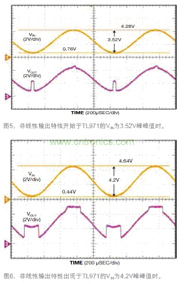 第二个例子使用一只TL971轨至轨输出的电压跟随器电路,但结果却不同。此时,运放采用一个单5V电源。从数据表规格可知,有保证的VICMR区间跨越了1.15V~ 3.85V范围,或中心在VCC/2的大约2.7V峰峰值。输入端加的是一个直流偏移为2.5V的1kHz正弦波。将VIN的幅度从200mV峰峰值调向更高电平,直到看到VOUT的变化。