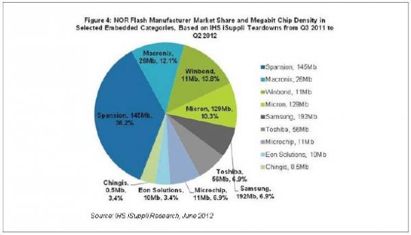 根据IHS iSuppli公司在三个季度内拆解分析的55个嵌入产品,这些产品中有三分之一以上的NOR芯片属于美国Spansion Inc.,在所有供应商中处于领先地位,如图所示。Spansion,以及韩国三星电子和美国美光,提供的NOR芯片平均密度为数百Mb。从2011年第三季度到今年第二季度,这三家公司占上述三个子领域中NOR芯片的53.4%。剩下的46.6%市场份额属于生产100Mb以下密度NOR闪存的厂商。这类厂商包括台湾旺宏电子和华邦电子等大型厂商,以及台湾常忆科技和宜扬科技等规模较小的厂商。