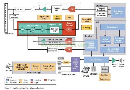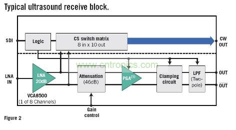 首先以超声波设备为例来探讨模拟性能需求。通过该范例,本文将介绍如何在性能、功耗、尺寸以及集成度之间进行权衡,并检测双极性与CMOS工艺技术的适用性。图1是典型超声波机器的系统方框图,展示了传输与接收两个部分。这两个部分负责驱动传感器与数字处理部分(未显示),从而构成完整的超声波设备。