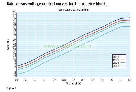在设计这种类型的接收??槭毙枰悸堑奈侍獍ㄊ淙朐肷⑾咝远?、增益以及功耗。给定封装尺寸的接收通道数量决定了集成度。从传感器接收到的信号可支持超过100dB的振幅变化。因此,低级信号(约10uV)端上的输入噪声与大型输入信号(约1V)的线性度都是非常重要的性能参数。要适应这种大的动态范围,可通过电压控制衰减器(VCA)和可编程增益放大器(PGA)调节通道增益。图3显示了几种PGA设置下,通过器件的总体增益随VCA上电压变化的情况。[page]