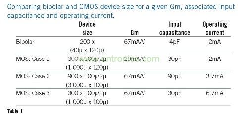 下面将比较双极性放大器与CMOS放大器的性能。双极性器件与CMOS器件都可用于设计支持4mA偏置电流的开环放大器???,实现20dB增益。这里把(TI内部的)BiCMOS工艺为目标工艺技术。