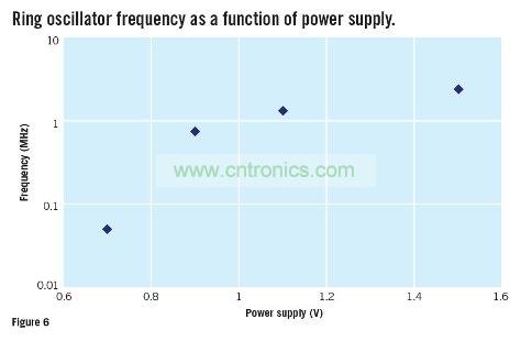 除了具备足够的工作性能外,根据以上要求,这些设备还需具备低断态漏电电流。这就意味着在这种工艺技术中必须权衡性能与漏电。一般来说,这些工艺的栅极长度在130nm到350nm之间,将来也可能达到到90nm。对于可移植设备而言,漏电流性能可随工艺、温度或电源的变化而变化,这是一个重要参数,因为它将直接影响电池的使用寿命。图4显示了采用NMOS工艺设备的漏电流(Ioff)与驱动电流(Idrive)随温度变化而变化的情况。Idrive与温度变化关系不大,而Ioff则具有显著的温度相关性。图5是PMOS设备的温度相关性图。由于温度变化幅度不大,Ioff随温度变动的情况可以接受。图6所示的是环形振荡器频率,是一项显示设备电源电压功能典型的品质因数,在实际应用中也可作为权衡漏电与性能的准则。