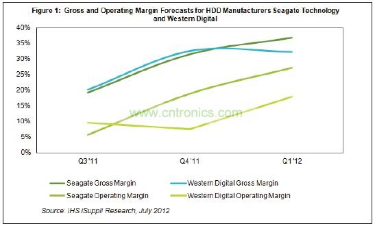 第一季度希捷的毛利率达到36.9%,高于去年第四季度时的31.6%,以及去年第三季度时的19.3%。泰国洪灾发生在去年第三季度。希捷的营业利润率上升幅度更大,从去年第四季度的18.9%跳增至27.2%,如图1所示。