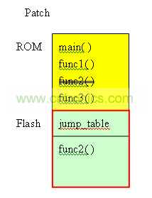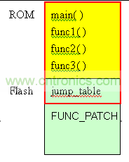 在上图中,黄色区域是IC的ROM,这部份的程序是IC制作出来即不可以改变。绿色部份是flash。在图中,flash分成2区,一个是jump_table,存放func1~func3的地址。剩余的空间FUNC_PATCH,预留给patch使用。