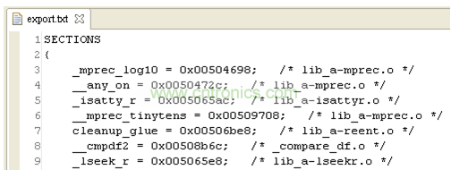 (2) patch在编译之前,先汇入主程序的symbol table。(将export.txt档案放在一起编译)。Patch的linker script要汇入主程序的symbol,写法如下面红色字体。