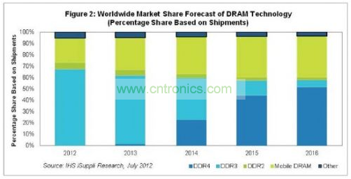 考虑到2011年出货量为零,今年出货量预计只占总体DRAM领域的1.4%,DDR4在2014年以前不会达到很大的规模。但DDR4市场两年后将迅速增长,2014年市场份额将增至23.1%,超过目前占主导地位的DDR3。