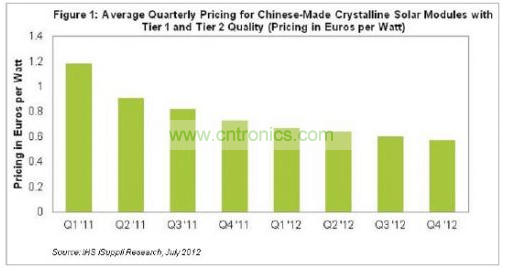 预计下半年晶体太阳能模组的平均市场价格仍将下跌11%,但跌幅略小于上半年的12%,并远小于2011年下半年的20%。预计2012年第四季度平均市场价格将从第二季度的每瓦0.64欧元跌至0.57欧元。模组通常以欧元计价,而硅则以美元计价。
