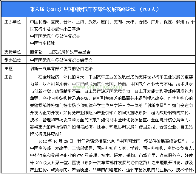 第六届中国国际汽车零部件发展高峰论坛,将以“创新—汽车零部件发展的必由之路”为主题,诚邀业界广泛参与,激情碰撞,智慧共享。