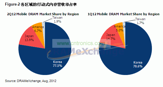 第二季行动式内存营收,三星半导体市占逼近全球60%,仍稳居龙头之位,韩系厂商占全球行动式内存营收的77.5%,较第一季仅小幅减少1.1%。第三名的日商尔必达市占则是小幅下滑0.8%来到13.9%,美商美光科技则受惠于中低阶智能型手机的成长,市占小幅成长至6.7%,位居第四。台系DRAM厂亦在行动内存市场中试图抢占一席之地,除了华邦电子之外,南科亦在本季营收当中初次崭露头角,目前比重虽然不高,但也为整个行动式内存的市场带来不同的氛围。值得注意的是由于下半年受到景气不确定因素的影响,各家内存制造商在下半年生产与开发的计划也逐渐转趋于保守,谨慎应对自2009年以来最严峻的景气寒冬。