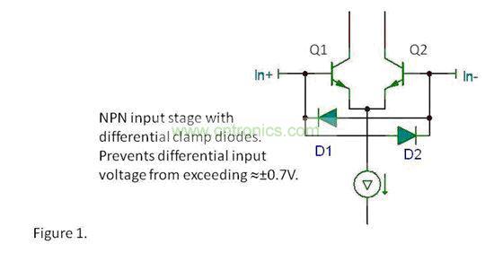 许多运算放大器都在输入端之间有电压钳位,其大多数一般都使用背靠背二极管(有时使用两个或者更多的串联二极管)来实施。这些二极管?;な淙刖骞苊馐芷浠岬惴聪蚧鞔┑乃鸷?。差动输入为约6V 时便会出现许多IC 工艺击穿,这会极大地改变或者损坏晶体管。下图显示了NPN 输入级,D1 和D2 提供了这种保护功能。