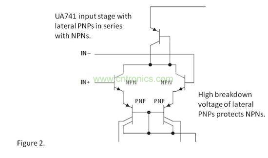 一般而言,双极NPN 晶体管运算放大器都有输入钳位,例如:OP07、OPA227 和OPA277 等。uA741 是一个例外,它具有NPN 输入晶体管,并且有一些为NPN 提供固有保护的附加串联横向PNP。