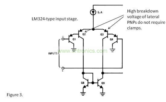使用横向PNP 输入晶体管的通用运算放大器一般没有输入钳位,例如:LM324" target="_blank" title="Link to Product Folder">LM324、LM358" target="_blank" title="Link to Product Folder">LM358、OPA234" target="_blank" title="Link to Product Folder">OPA234、OPA2251" target="_blank" title="Link to Product Folder">OPA2251 和OPA244" target="_blank" title="Link to Product Folder">OPA244。这些运算放大器一般为“单电源”类型,其意味着它们拥有一个扩展至负电源端(或者稍低)的共模范围。输入偏置电流为一个负数时,表示输入偏置电流自输入引脚流出。这时,我们通??梢匀隙ㄋ俏饫嘣怂惴糯笃?。但是,需要注意的是,使用PNP 输入的高速运算放大器一般有输入钳位,而这些PNP 是一些具有更低击穿电压的垂直PNP。