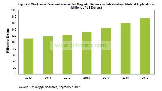 2011年工业与医疗磁性传感器营业收入为1.182亿美元,而2010年是1.119亿美元。尽管该领域的营业收入少于汽车和无线-消费等其它磁性传感器领域,但将促进未来几年传感器市场持续扩张。到2016年,这个磁性传感器领域的营业收入将增至1.755亿美元,如图所示,五年复合年度增长率为8%。