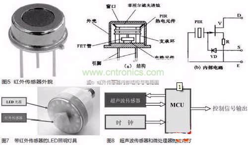 被动式红外传感器有三个关键性的元件:菲涅尔滤光透镜,热释电红外传感器和匹配低噪放大器。菲涅尔透镜有两个作用:一是聚焦作用,即将热释红外信号折射在PIR上:二是将探测区内分为若干个明区和暗区,使进入探测区的移动物体/人能以温度变化的形式在PIR上产生变化的热释红外信号。一般还会匹配低噪放大器,当探测器上的环境温度上升,尤其是接近人体正常体温(37℃)时,传感器的灵敏度下降,经由它对增益进行补偿,增加其灵敏度。输出信号可用来驱动电子开关,实现LED照明电路的开关控制。图5是红外传感器外貌,图6是红外传感器内部结构与内部电路图。图7是带红外传感器的LED照明灯具,这是一款E27标准螺口灯头的灯具,其电源适用范围是AC180V-250V(50/60Hz),红外传感器检测范围大约在3m~15m,其标准产品IFS-Bulb3W灯具达80lm,5W灯具达140lm.在LED光源??榈闹醒氩糠智度牒焱庀叽衅鳌R坏┖焱獯衅骷觳獾饺说奶逦?,LED电灯泡将会在50s内自动开启与关闭。适用于任何一种室内应用,如走廊、储藏室、楼梯和大厅入口处。