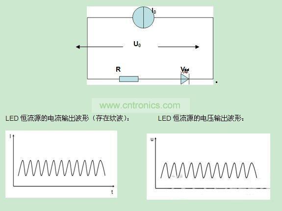 假设LED驱动此时输出的电流值I0为100mA,R=10Ω,二极管导通电压Vd=30V,那么实际的LED灯拉载时,LED驱动的输出电压U0=100mA*10Ω+30V=31V,输出为31V/100mA。假设恒流源的输出电流纹波为10mA, LED驱动的输出电压纹波实为10mA*10Ω=0.1V。