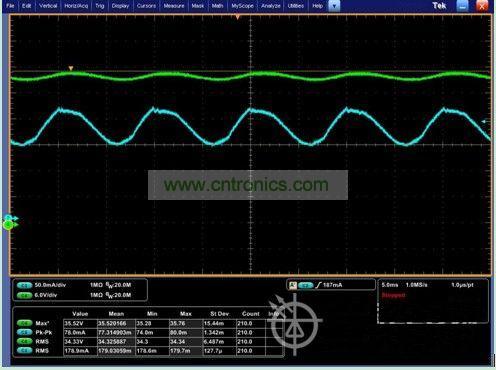 下图为艾德克斯IT8800模拟LED灯测试LED恒流源时的波形图: