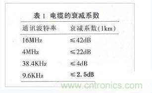 导线的电阻对信号的影响很小,可以忽略不计。电缆的分布电容C主要是由双绞线的两条平行导线产生。信号的损失主要是由于电缆的分布电容和分布电感组成的LC低通滤波器。通讯波特率越高,信号衰减也会越大。常规电缆的衰减系数见表1。