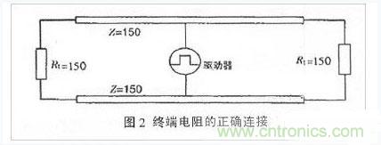 ②阻抗不连续,顾名思义,与光从一种媒质进入另一种媒质时所引起的反射是相似的。信号在传输线末端突然遇到电缆阻抗很小甚至没有,信号在这个地方就会引起反射。消除这种反射最常用的方法,是在电缆的末端跨接一个与电缆的特性阻抗同样大小的终端电阻,使电缆的阻抗连续。由于信号在电缆上的传输是双向的,因此,在通讯电缆的另一端同样要跨接一个相同大小的终端电阻,如图2所示。