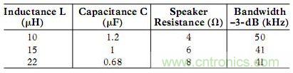 常见的滤波器设计选择目的是为了在所需要的最高音频频率条件下将滤波器响应下降减至最小以获得最低带宽。如果对于高达20 kHz频率,要求下降小于1 dB,则要求典型的滤波器具有40 kHz巴特沃斯(Butterworth)响应(以达到最大平坦通带)。对于常见的扬声器阻抗以及标准的L值和C值,下表给出了标称元器件值及其相应的近似Butterworth响应: