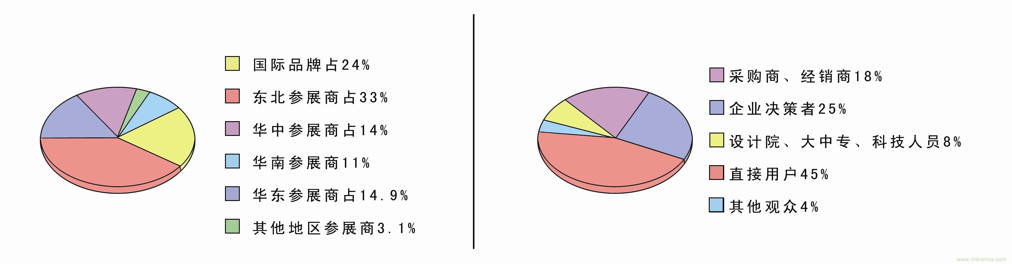 上届展会于2012年5月16-18日在大连星海会展中心举行,展会规模已达一万多平方米,四百多个展位。世界知名的厂商:西门子、ABB、施耐德、三菱电机、奥托尼克斯、欧姆龙、LG、艾默生、宝帝、威图、米思米、町洋机电、汇川等企业齐聚一堂,美国、日本、韩国等国外展团的大量参与,使展会更具吸引力;展会的观众主要来自东北、华北、华东、华中、西北、台湾、香港及日本、韩国、俄罗斯等地,其主要为相关行业的决策人士、技术人员及采购负责人。本届展会为切合您的需求,直接面向专业买家、进出口商、分销商、代理商和直接用户,为您缔造更多的商机!此次展会有参展商三百多家,参观商两万余人,其中各占比例如下: