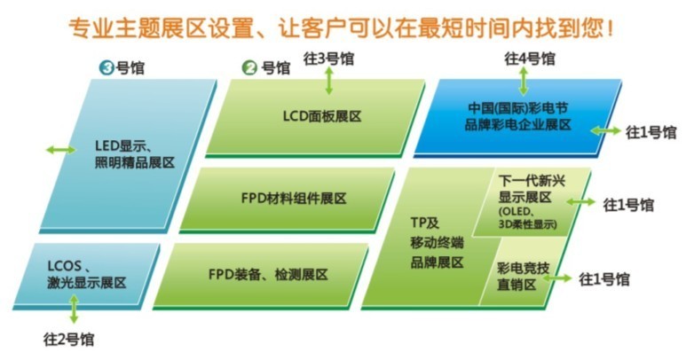 作为光电显示行业的标志性活动,深圳光电显示周暨中国(国际)彩电节将一如既往地覆盖光电显示全产业链,设立LCD面板展区、FPD材料组件展区、FPD装备及检测展区、彩电节品牌展区、彩电竞技直销展区、TP及移动终端品牌展区、下一代显示展区等7大专区,主要展示液晶显示、OLED、触控、TV、3D等上中下游产业链最新技术与最新产品等。