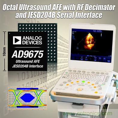 【导读】ADI最近推出了8通道超声模拟前端(AFE)AD9675,该器件内置片内RF抽取器和JESD204B串行接口,针对中高端便携式和手推式医用及工业超声系统而设计。